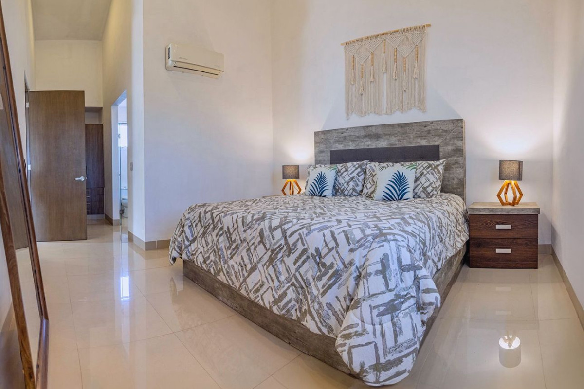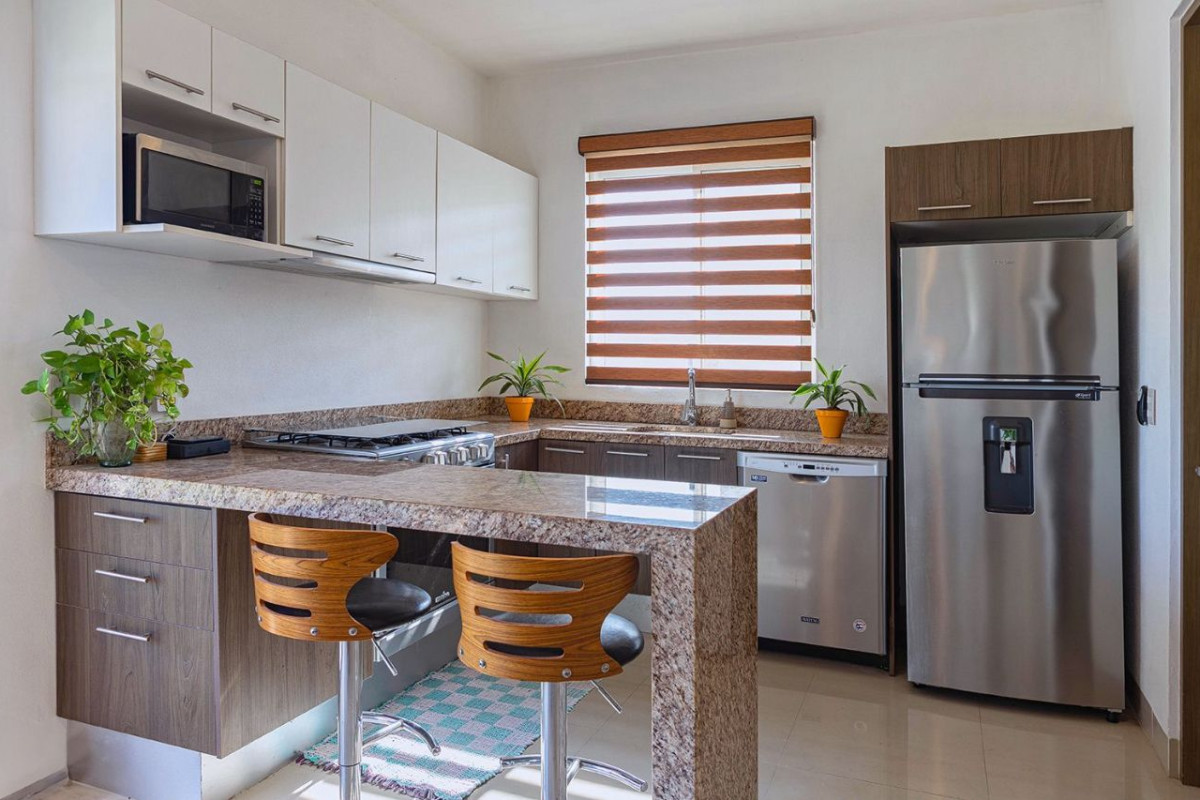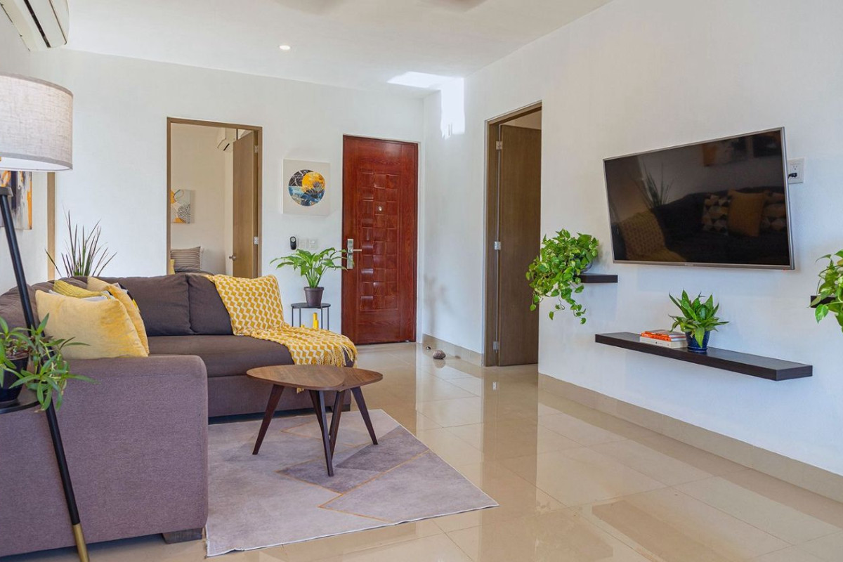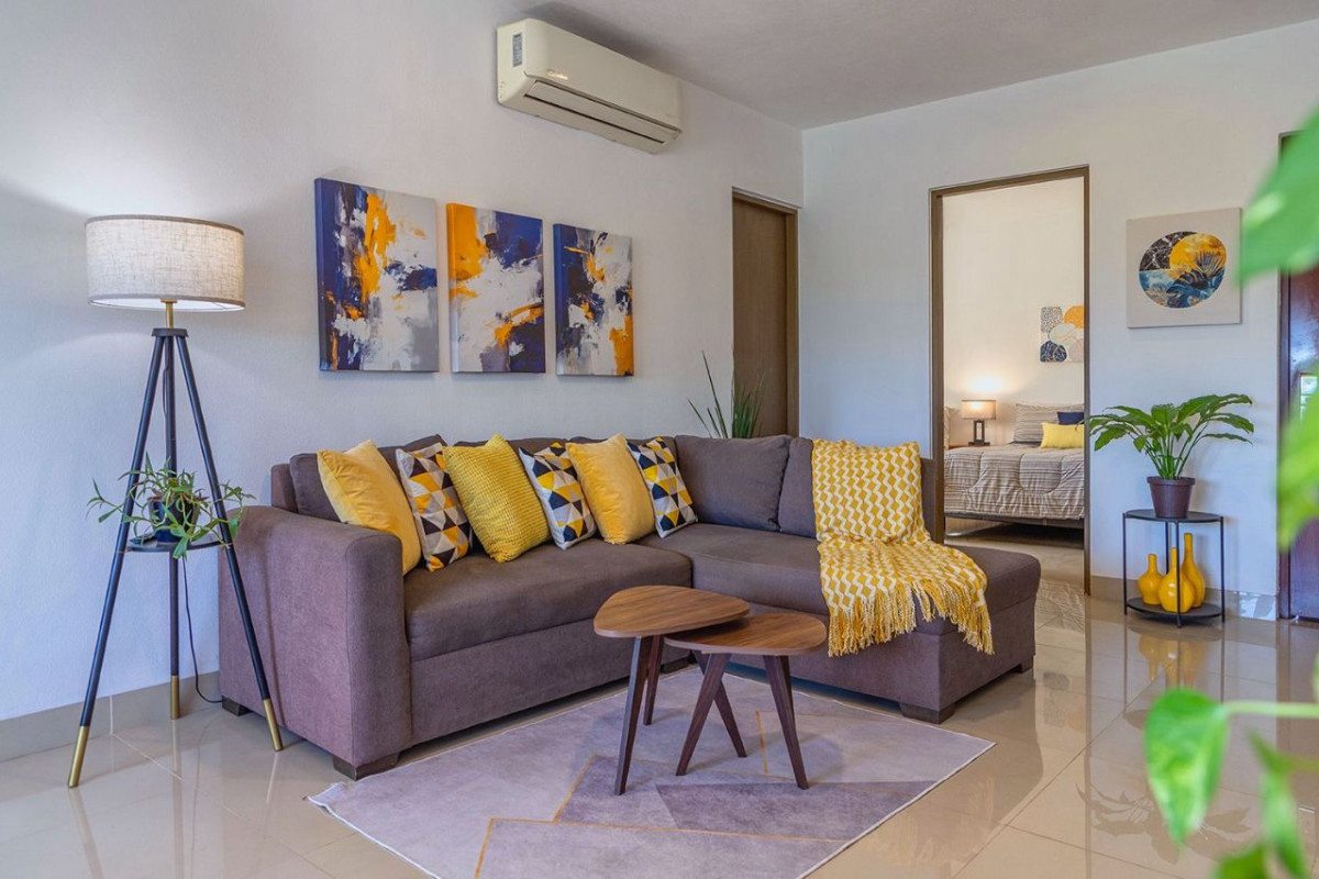 Fully furnished 2-bedroom, 2-bath condo in the gated community Azulejos. Bright, air-conditioned living area with open kitchen, granite countertops, and stainless steel appliances. The primary bedroom features a cathedral ceiling, ensuite bath, and ample closet space. Second bedroom ideal for guests or a home office. Community amenities include gym, jacuzzi, swimming pool, BBQ area, and lounge. Pet-friendly and minutes to Vidanta, golf, beaches, the airport (12 min) and the Romantic Zone (40 min).